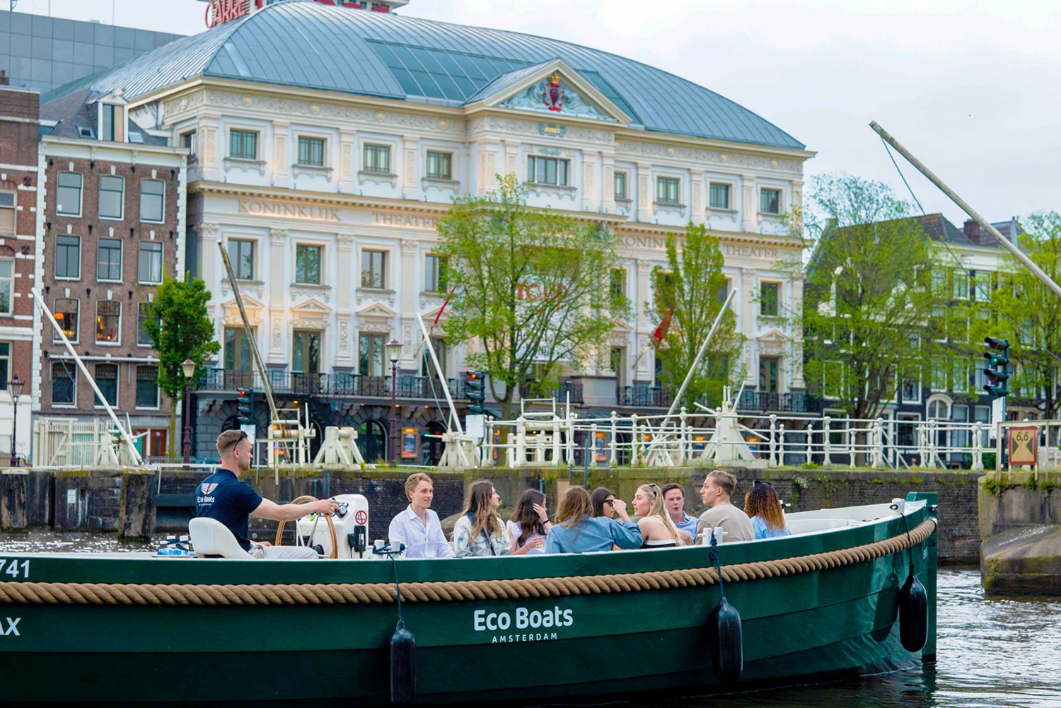 Vi afgår lige foran Amsterdam Centraal Station i en af vores splinternye, stilfulde og elektriske øko-både.