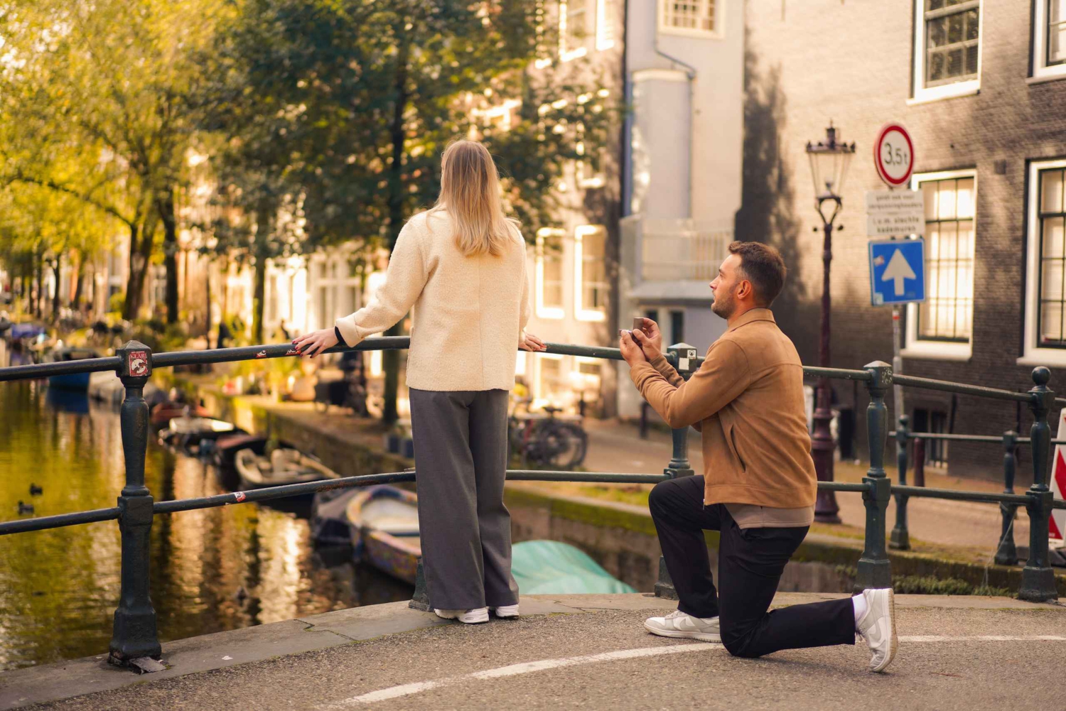 Sessionen starter på et bestemt sted i Amsterdam, som er nøje udvalgt til at skabe en romantisk og malerisk kulisse for jeres frieri. Hvis du har et andet sted i tankerne, er vi glade for at kunne imødekomme det mod et ekstra gebyr. Vores professionelle fotograf vil fange det præcise øjeblik, hvor du frier, og sikre, at alle følelser og detaljer bevares på smukkeste vis.