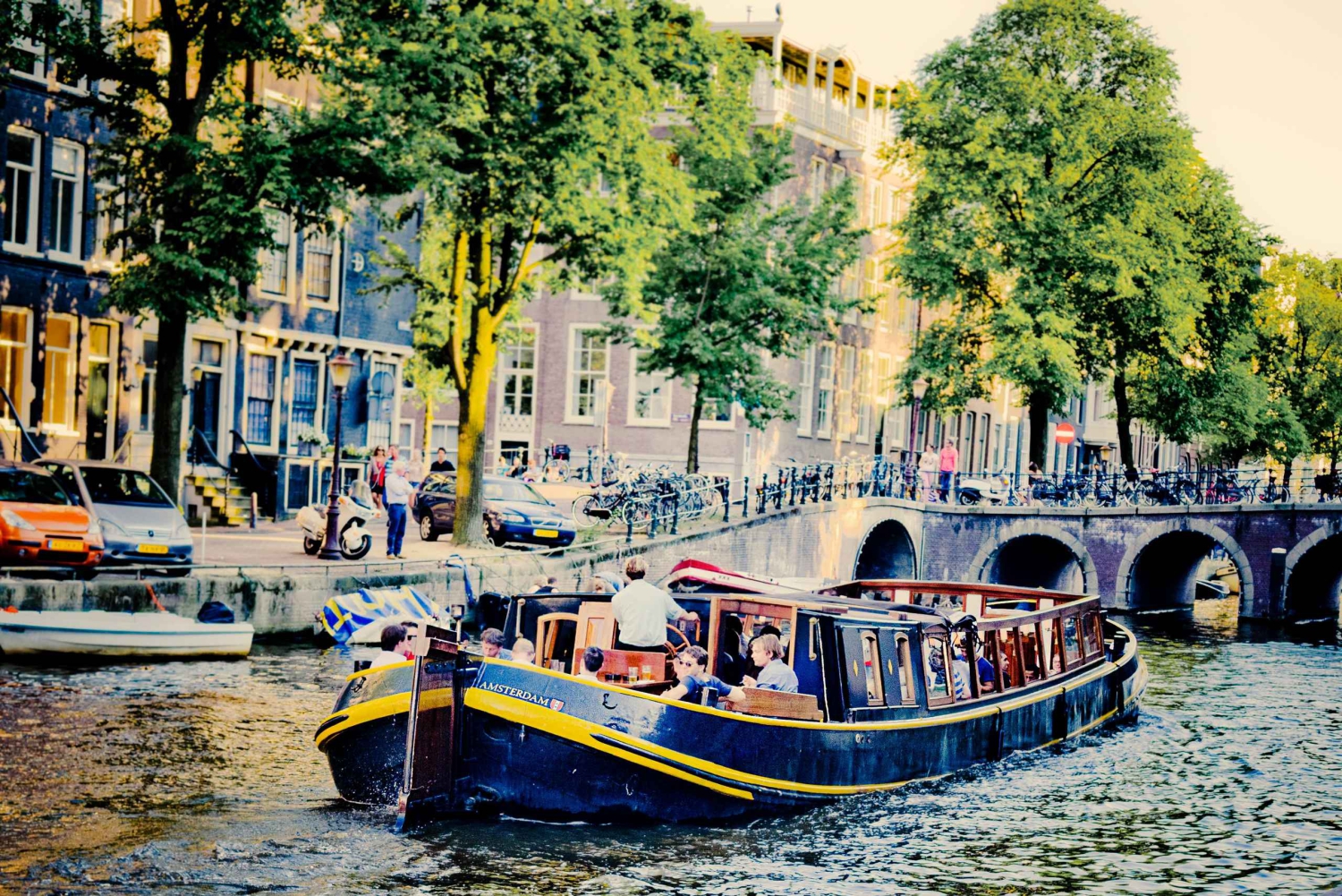 - Risteile Amsterdamin valaistujen kanavien läpi lämmitetyllä salonkiveneellä.