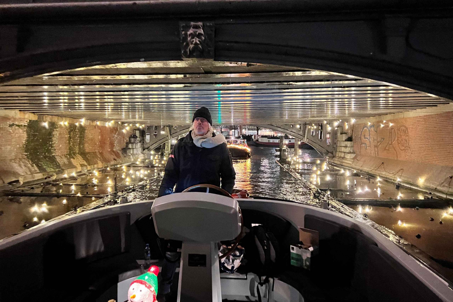 Vivi una notte unica e bellissima su una barca all'aperto durante il Festival delle luci di Amsterdam.
