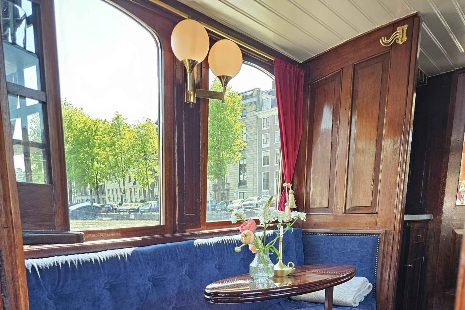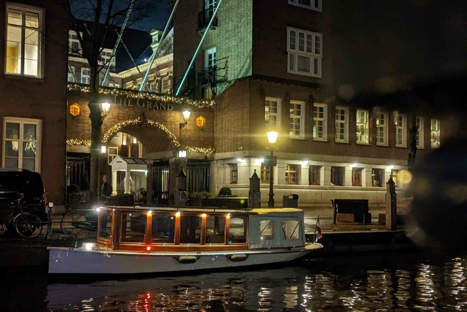 Aan boord van een klassieke, prachtig gerestaureerde salonboot stap je in een warme, drijvende woonkamer. Het schip, vaak met gepolijst mahonie, koperen details en grote, verwarmde ramen - soms zelfs met dubbele beglazing om beslaan te voorkomen - is een toevluchtsoord tegen de kou. Je reis begint met een vleugje authentieke Nederlandse gastvrijheid: een gratis welkomstdrankje. Of het nu een sprankelende prosecco is om op de avond te proosten of een warme drank zoals koffie of thee om de koude lucht te verjagen, deze eerste slok zet de toon voor een avond vol luxe en verwondering.