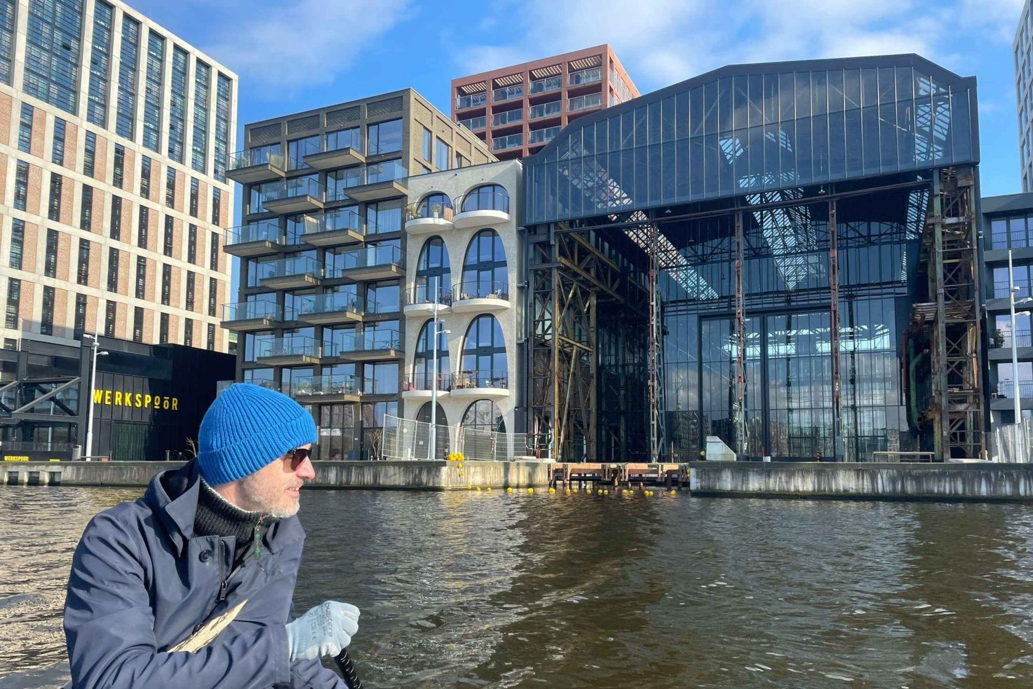 Dołącz do mnie na łatwą 5-kilometrową wycieczkę kajakową z Eastern Docklands do Wysp Wschodnich we wschodniej części Amsterdamu. Tutaj budynki i woda opowiadają historię Amsterdamu od XVII wieku do współczesności.