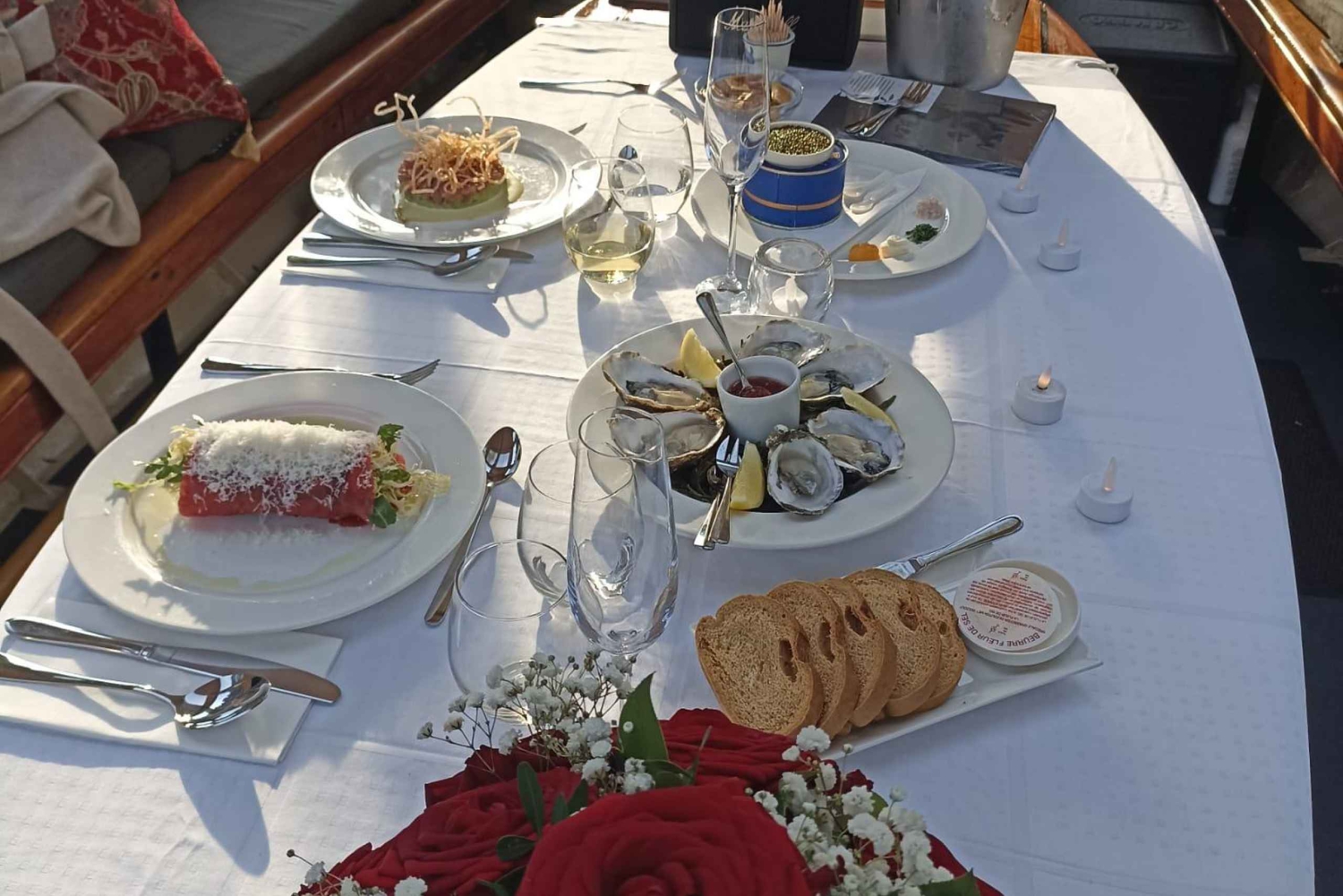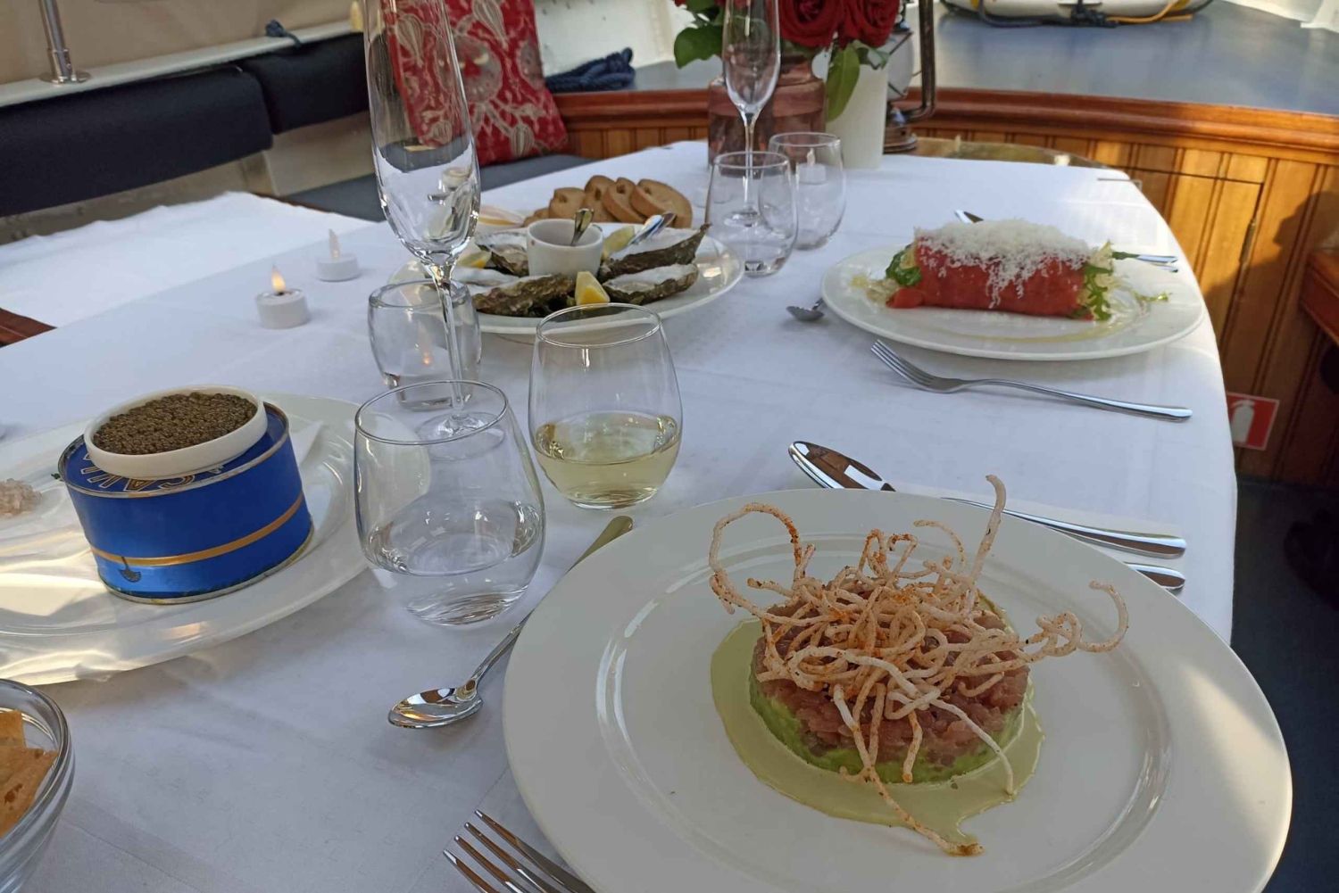 Um cruzeiro privado com jantar, apenas tu, o teu parceiro e o capitão a bordo.