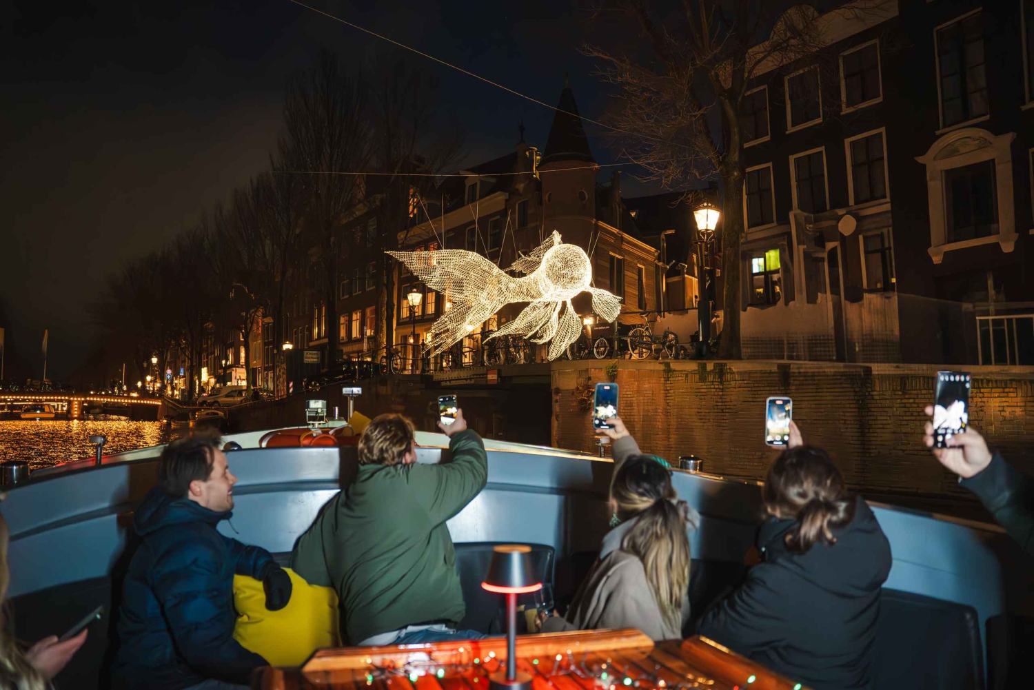 Насладитесь уникальной и прекрасной ночью на лодке под открытым небом во время Фестиваля света в Амстердаме.
