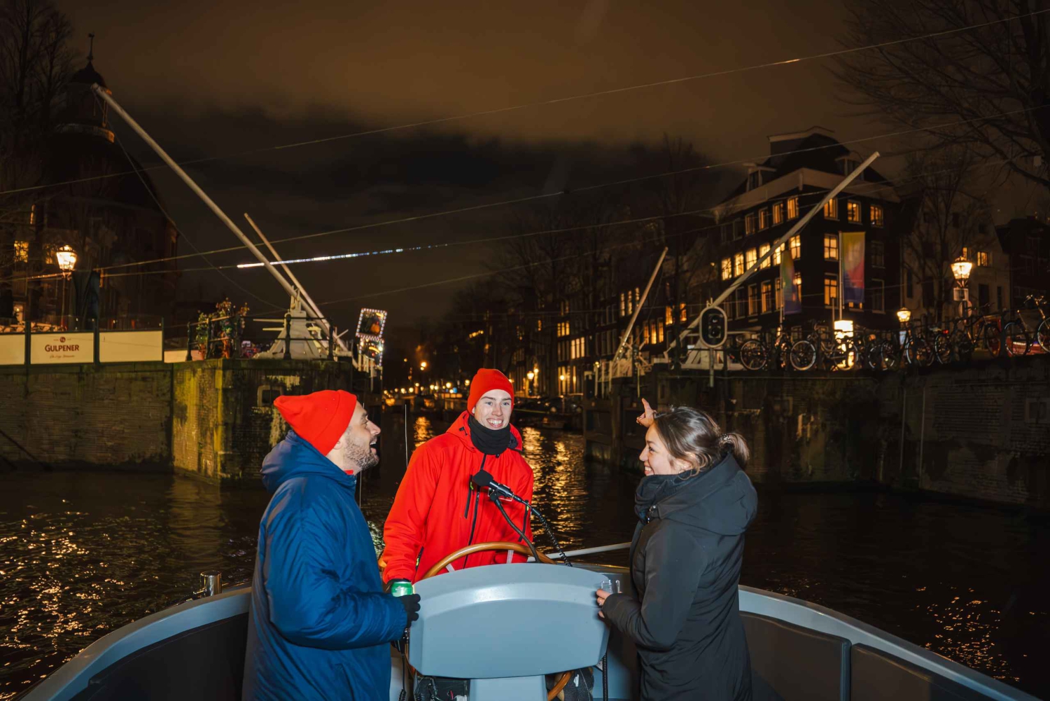 Наслаждайтесь панорамным видом с открытой лодки, проплывая мимо освещенных купеческих домов и под романтическими мостами реки Амстел. Посмотрите, как некоторые культурные учреждения города сверкают на фоне ночного неба.